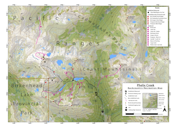 A topographic, backcoutry recreation map of the Phelix Creek area. Intended for summer and winter users of the Varsity Outdoor Club’s Brian Waddington Hut. Suitable for hikers, climbers, and skiers.